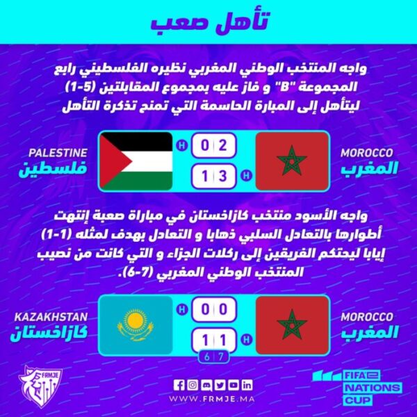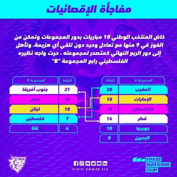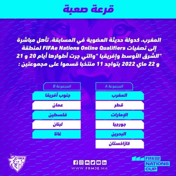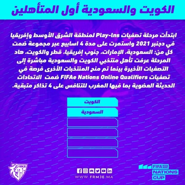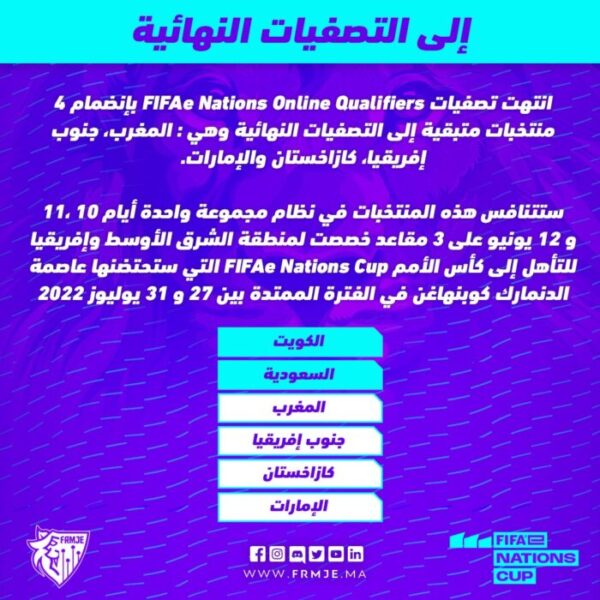 Le Maroc rejoint dont l’Arabie Saoudite et le Kuwait plus l’Afrique du Sud, le Kazakhstan, les Émirats arabes unis qui ont réussi à arracher également leur ticket pour les Playoffs de la FIFAe Nations qui se dérouleront le 10, 11 et 12 juin prochain. Les 6 nations s’affronteront pour décrocher un des trois tickets attribués à la région Afrique et Moyen Orient qualificatifs à la FIFAe Nations Cup.