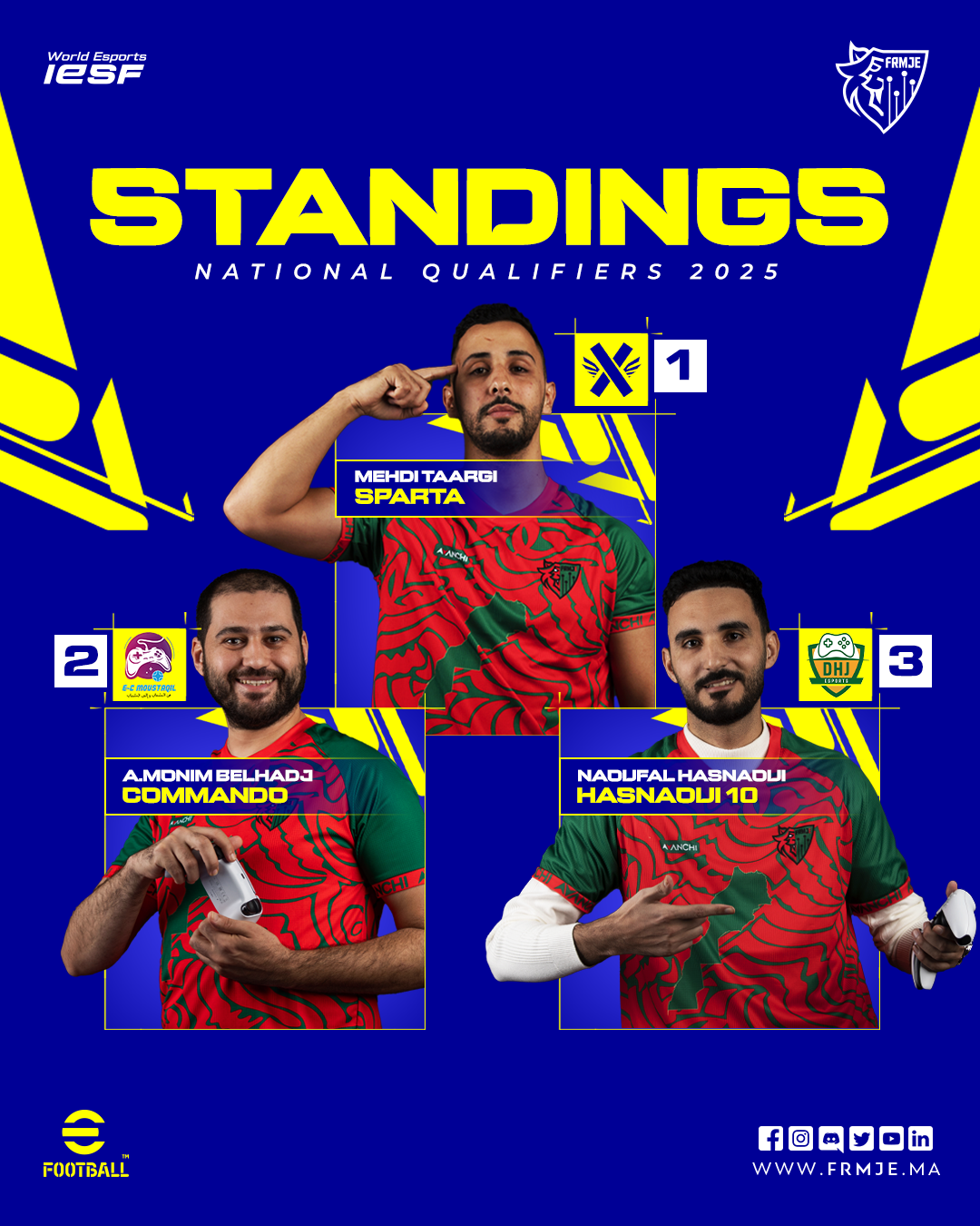 La Fédération Royale Marocaine des Jeux Électroniques (FRMJE) a le plaisir d’annoncer que Mehdi Taargi a remporté la phase nationale des qualifications IESF dans la discipline eFootball Console, s’imposant face aux meilleurs joueurs du Royaume.